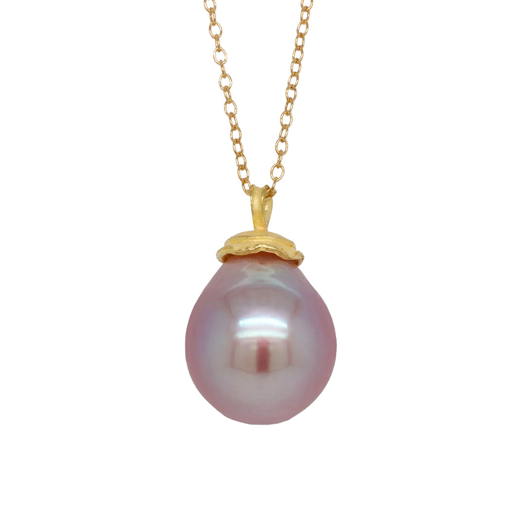 A luminous freshwater pearl takes center stage, its soft metallic pink tones shifting with a subtle iridescence. Suspended from a refined gold setting, the design highlights the pearl’s natural beauty with an understated, elegant simplicity.