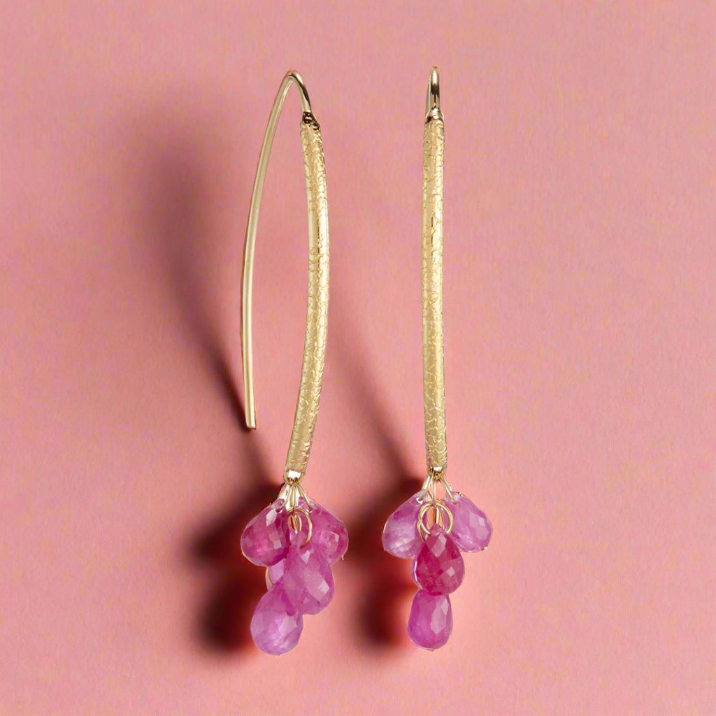 Textured navette wire earrings in 18-karat gold with varying shades of faceted pink sapphire briolette drops. A classically trained goldsmith, Barbara Heinrich is known for her contemporary designs, multi-textured finishes and use of vibrant gemstones. The award-winning jeweler draws inspiration from nature to create pieces that exude elegance and timeless beauty.