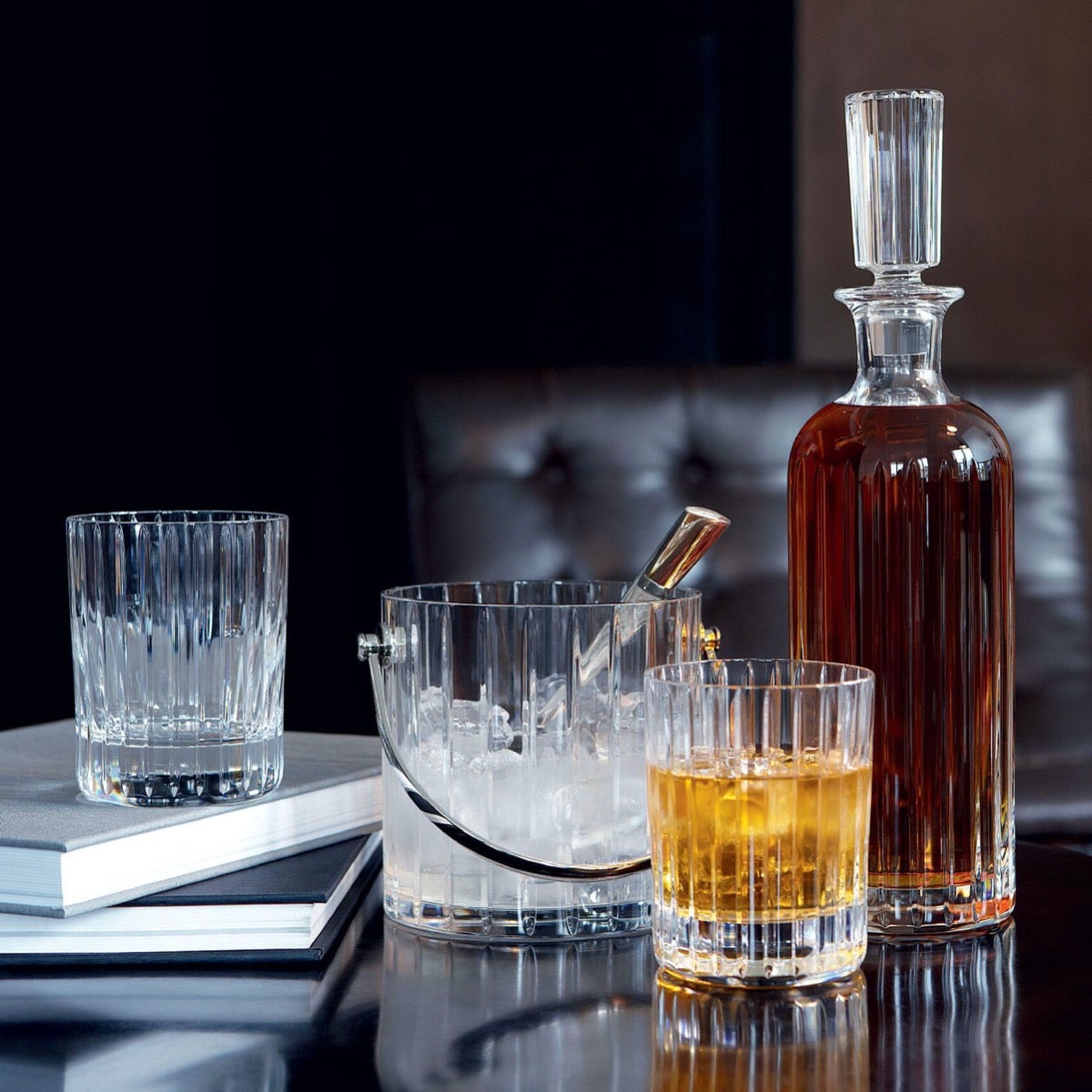 The Harmonie collection is distinguished by consecutive parallel cuts that travel vertically along each crystal creation. Exhibited at the MoMA in New York, the "Baccarat Crystal Set" by Jeff Koons was inspired by this iconic design.