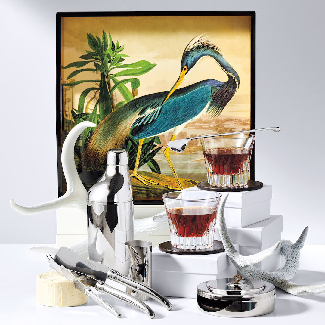 Bringing the glamour and sophistication of New York in the Roaring '20s to your bar, this set of coasters is made of smooth luxurious leather and then housed in a sleek stainless steel case. The lid is inspired by the geometric details found in Art Deco architecture; its leather handle matches the four stitched mats. The perfect gift for those who enjoy the finer things in life.