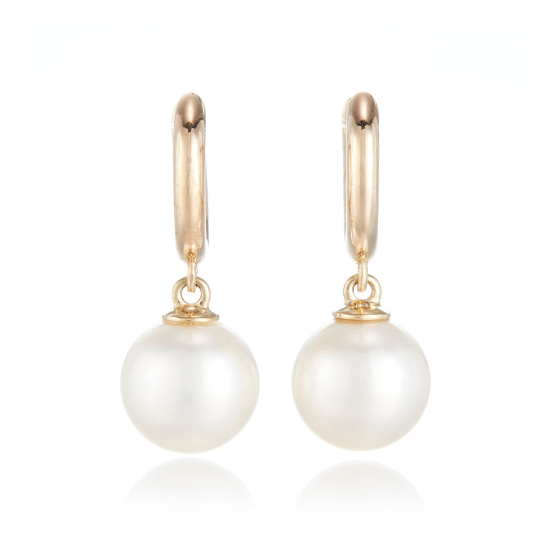 Our exclusive earrings feature white freshwater pearls playfully dangling from yellow gold huggie hoops.