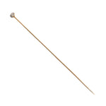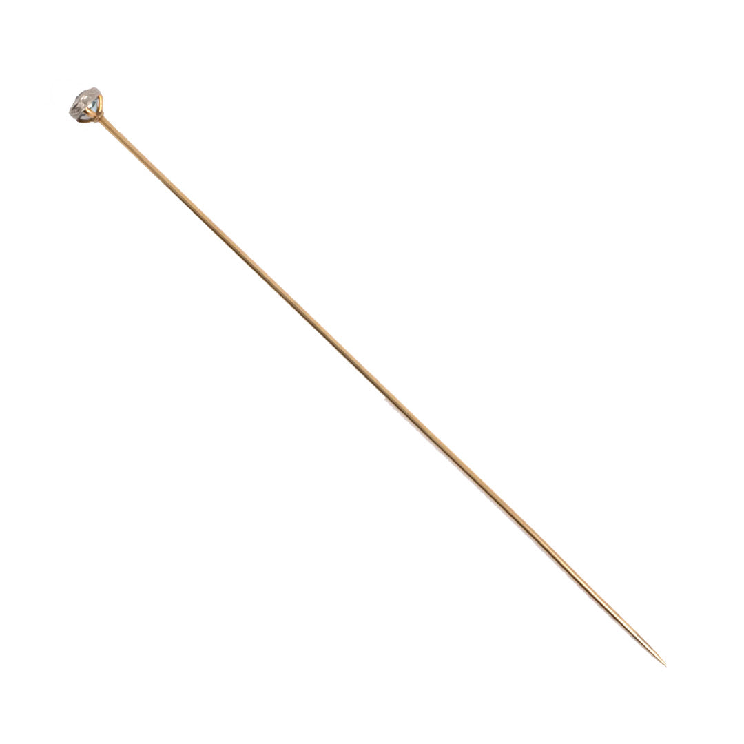 A shimmering aquamarine crowns this Edwardian hat pin, its pale blue brilliance set in a finely engraved gold and platinum mount. The elongated design evokes the elegance of the early 20th century, when such pins were both practical and ornamental — securing elaborate hats while adding a flash of refined color.