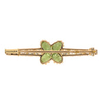 This Victorian bar pin marries symmetry with sentiment, centering a cross motif of vivid green peridots around a single cushion-cut diamond. Additional diamonds extend along the gold frame, their sparkle amplifying the jewel’s refined balance of color and light so prized in the era.
