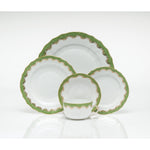 Made of white porcelain and handpainted by master artisans in Hungary, this elegant saucer is bordered in green and 24-karat yellow gold. Herend’s porcelain creations feature a signature pattern that dates back to 1858, when a fish-scale decoration inspired a craftsman to create a similar design imitating feathers. 5 1/2" diam.
