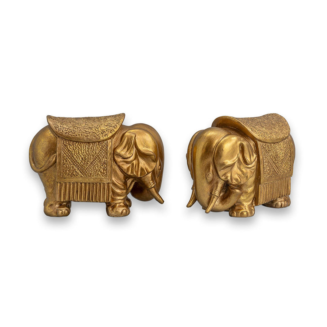 Richly adorned and full of charm, this regal duo brings a stately presence to shelves, bookends or mantels alike. Made of polystone and finished in a golden tone, each elephant makes a strong case for a little decorative grandeur.