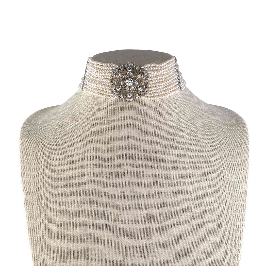 Eleven strands of luminous pearls flow like silk into a dramatic medallion anchored by a radiant diamond at its heart. Pavé-set accents and scalloped filigree lend texture and glamour to the centerpiece, while diamond-set separators echo the symmetrical sophistication of the period. More than a choker, it’s a triumph of 1920s opulence made modern again.