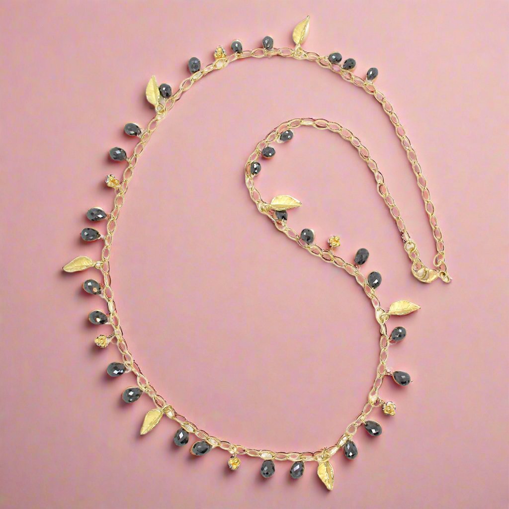 Faceted black diamond briolette drops are accented with gold wavy leaves on this twisted link chain necklace.