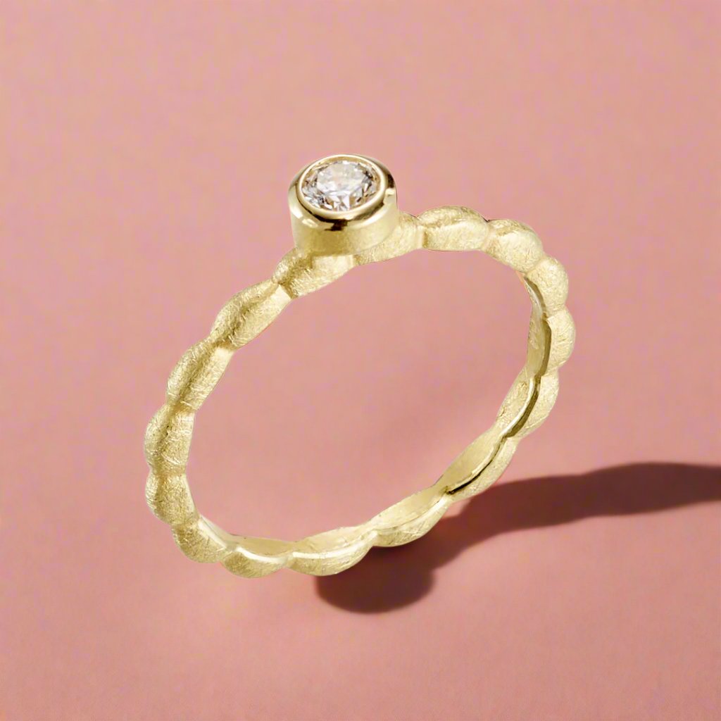 A round diamond stacking ring with an 18-karat gold plain bezel on a pillow band.