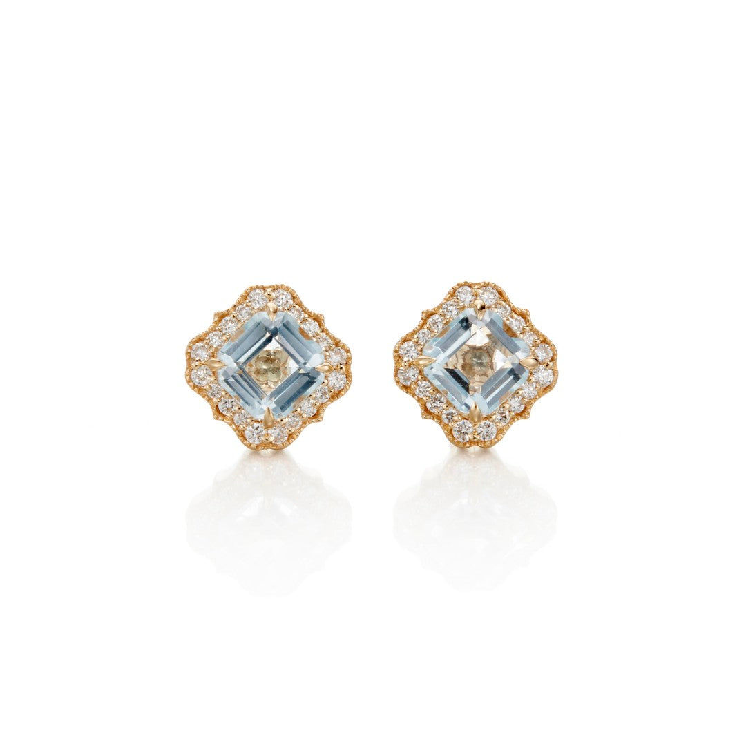 Cradled in a golden frame, these Swiss blue topaz earrings are highlighted by a constellation of diamonds, presenting a celestial charm that catches the eye.