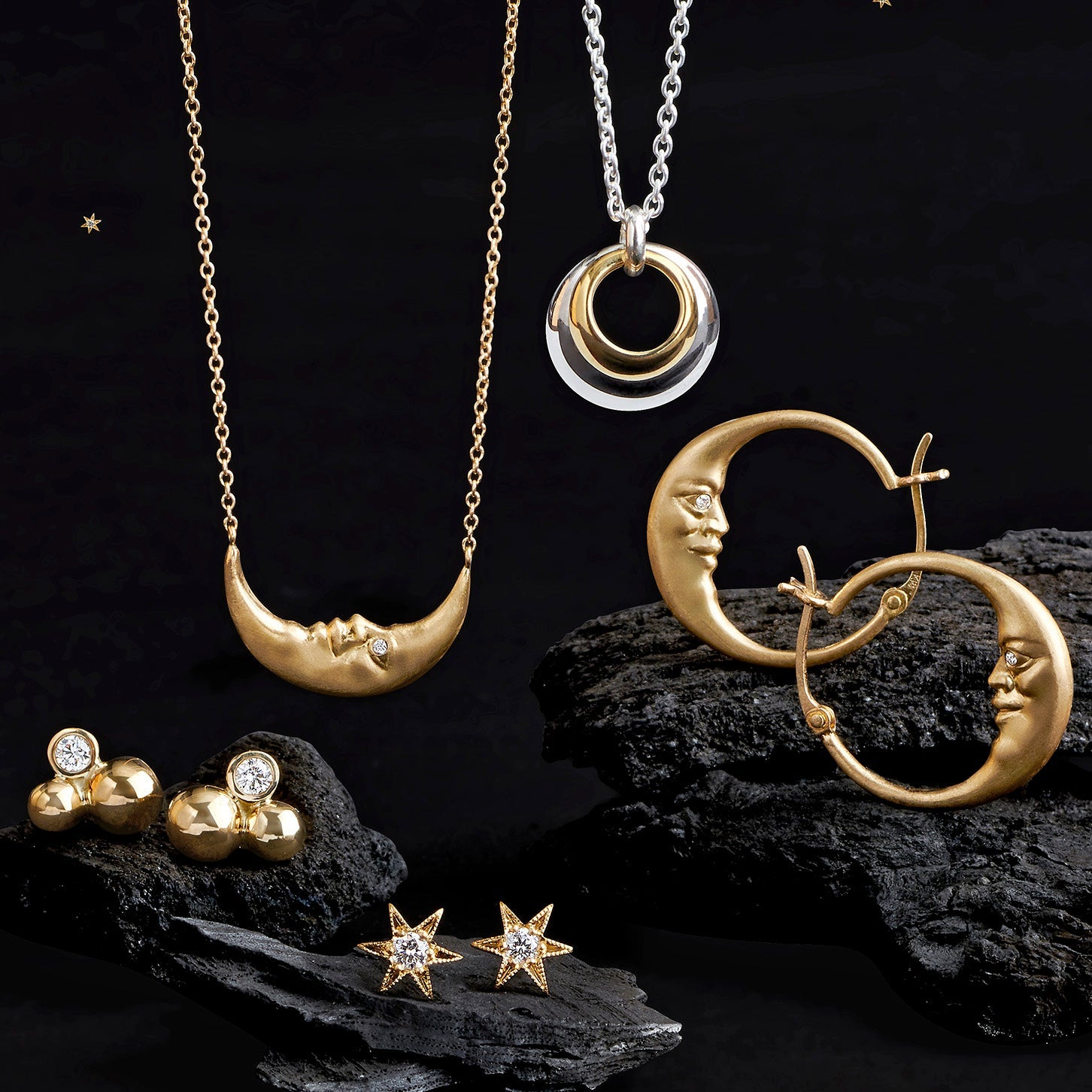 Sculpted in the shape of a crescent moon with a face, these distinctive yellow gold hoop earrings are embellished with white diamond eyes.