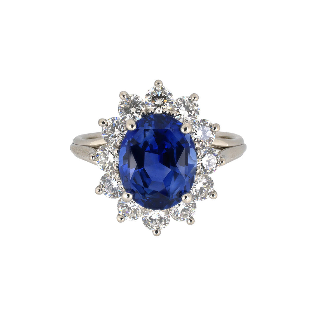 Every detail in this platinum cluster ring serves to exalt the vivid Ceylon sapphire at its center, framed by a halo of brilliant-cut diamonds. The silhouette nods to mid-century glamour, where bold color and icy brilliance were paired with precision craftsmanship to create timeless statements of elegance. Gump’s is forever treasure hunting for the best of everything and our collection of estate jewelry — featuring rare antique pieces — is no exception. Distinguished in provenance, each item is one of a kind, reflecting its distinctive gemstones, materials and craftsmanship
