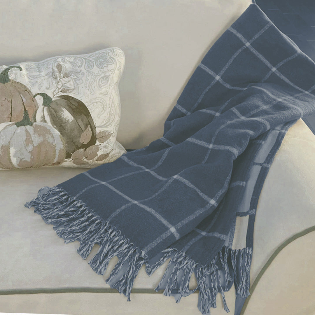 Loomed in Portugal from a blend of cotton and acrylic, this throw is lusciously soft and cozy and the perfect weight for any season. In a classic denim blue, it's woven with an airy windowpane pattern that gives it tailored style.