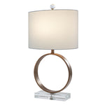 A luminous study in balance, this lamp frames an open brass ring above a sculpted block of crystal, giving the form a quiet architectural presence. The interplay of metal and glass feels both modern and timeless, as if drawn from a gallery of mid-century silhouettes. Topped with an oval shade and finished with a crystal finial, this piece brings a serene clarity to the spaces it inhabits.