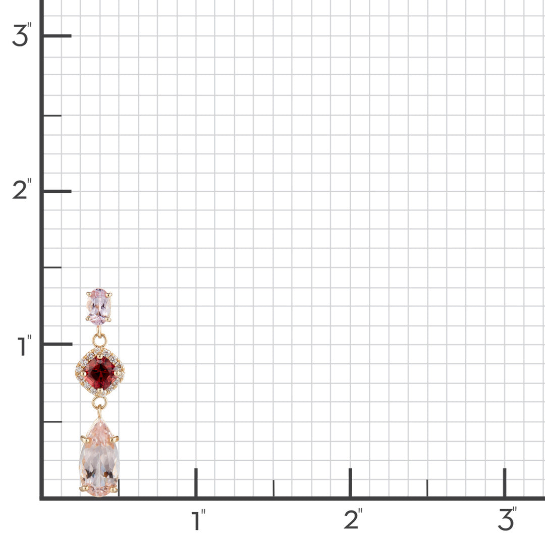 A graceful study in contrast and color. Blush-toned morganite and deep red garnet form an elegant trio, tiered with diamonds for added shimmer and dimension. The effect is refined, with just enough drama to hold its own after dusk.