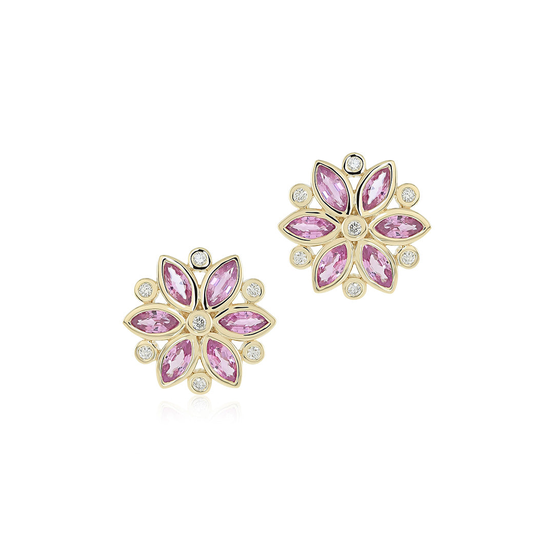 A flourish of pink sapphires forms the petals of these exuberant floral earrings, each one framed in warm 14-karat yellow gold. Scattered diamonds add a luminous accent, lending a touch of sparkle to the joyful bloom.
