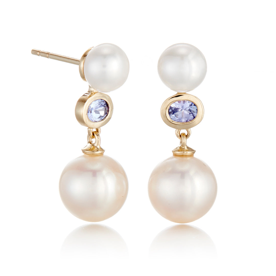 Our drop earrings feature freshwater pearls in two sizes, paired with a hint of tanzanite sparkle, crafting a unique visual rhythm that enchants and captivates. Simple statements of elegance, pearls have been a mainstay in Gump's fine jewelry assortment for decades. Revered for their alluring luster and classic beauty, they are widely recognized as symbols of purity, integrity and wisdom gained through experience.