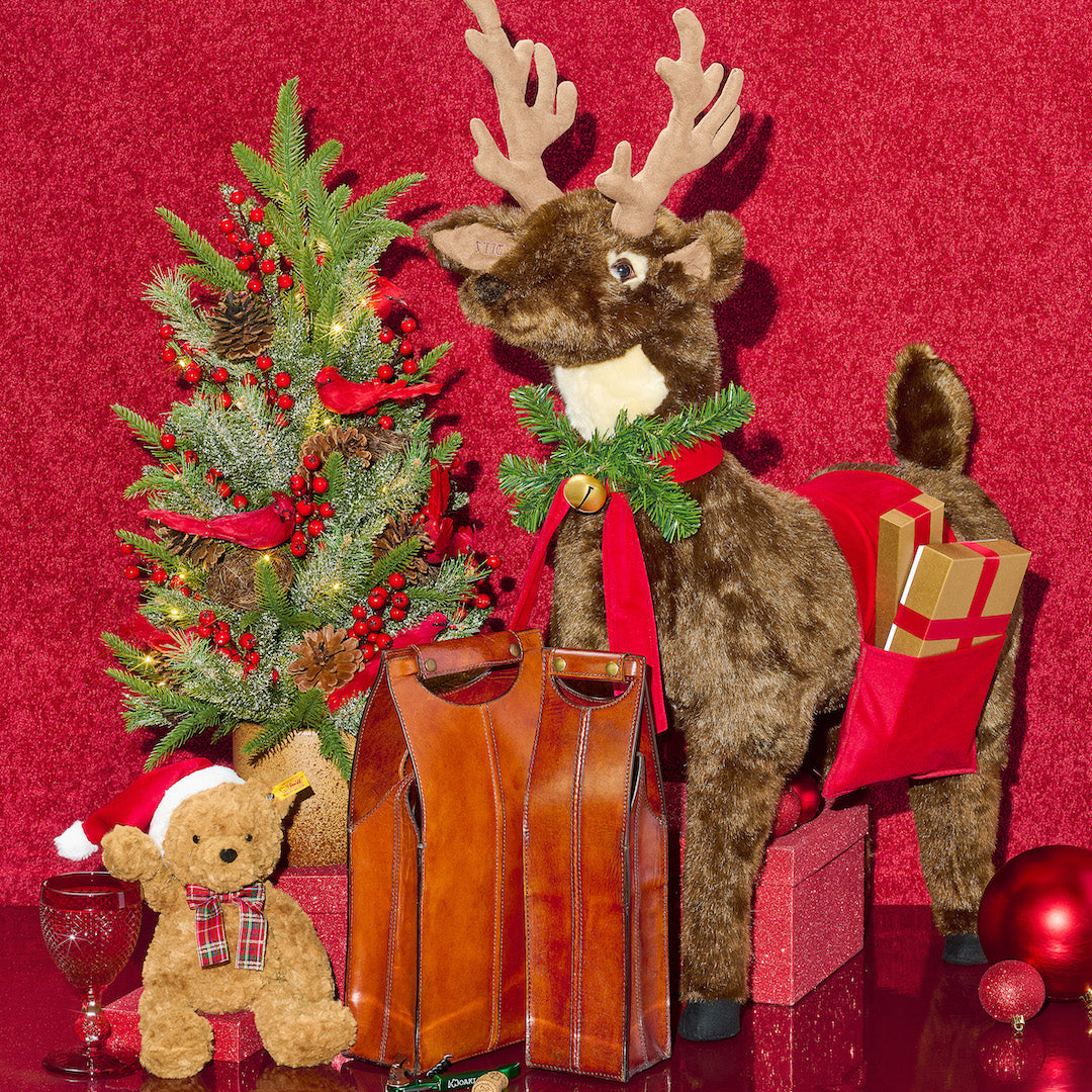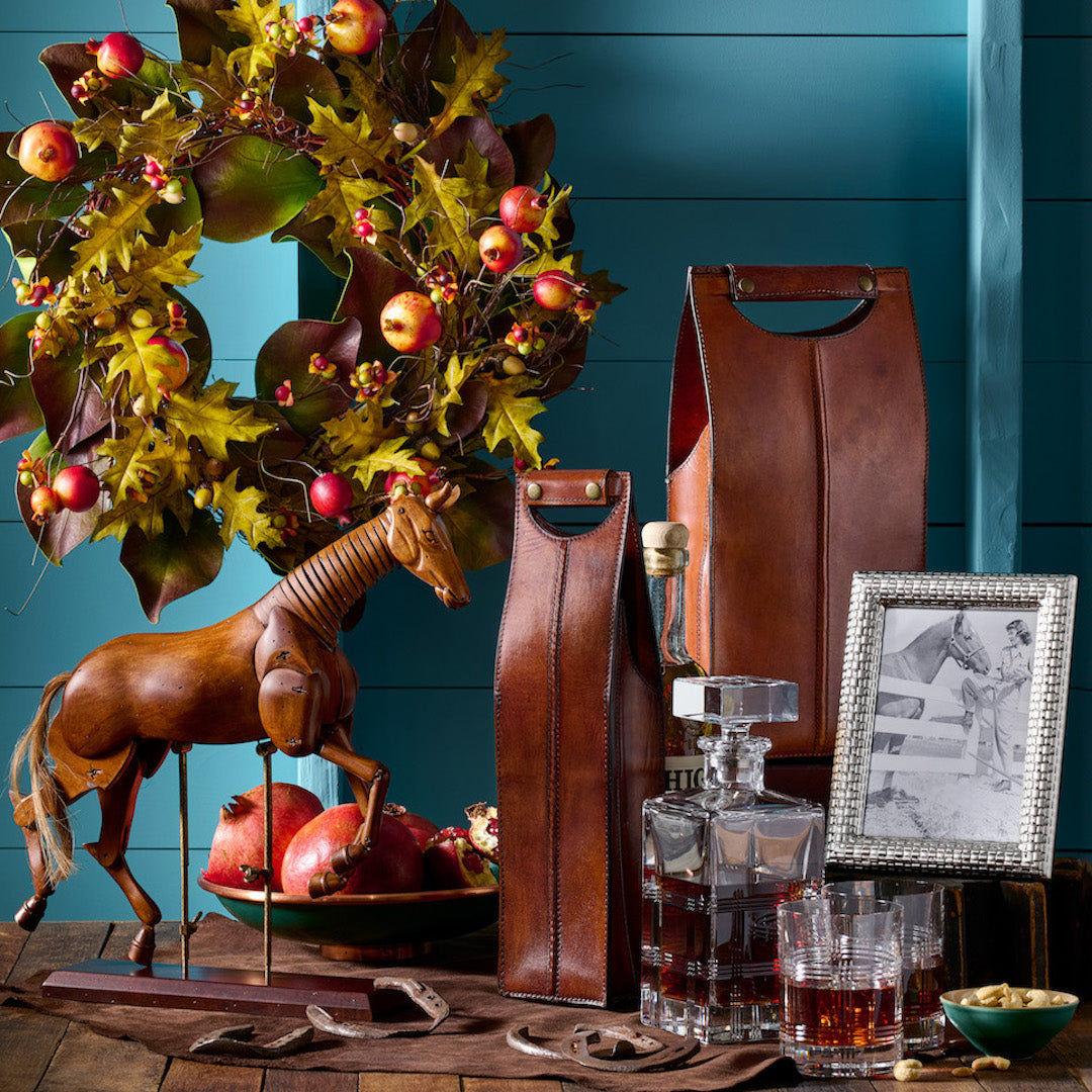 Our sturdy leather carrier transports your favorite vintage safely and in style. The bottle slips into a protective compartment; the top snaps shut to create a comfortable handle.