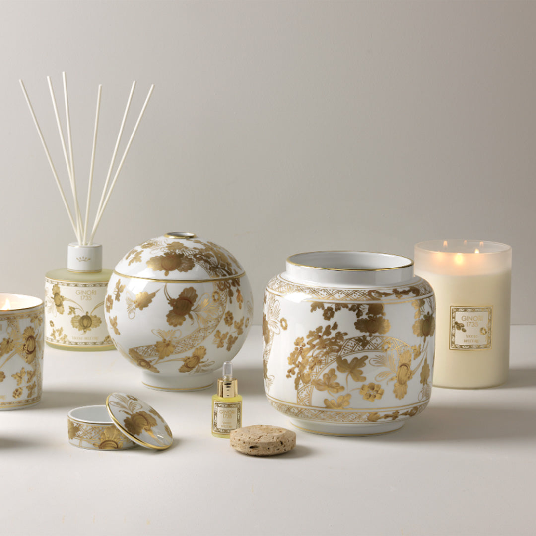 Use this vase to house a candle of your choosing as an elegant way to bring light to a dinner or side table. Or, try stacking two or three of them in the the same Orient Italiano color or a mix of colors to create a beautiful objet d'art. Designed by Gio Ponti in 1946, the Oriente Italiano collection brings together elements of East and West to brilliant effect. Stylized garofani, or carnations, blossom on handcrafted porcelain in a palette of gold and white.