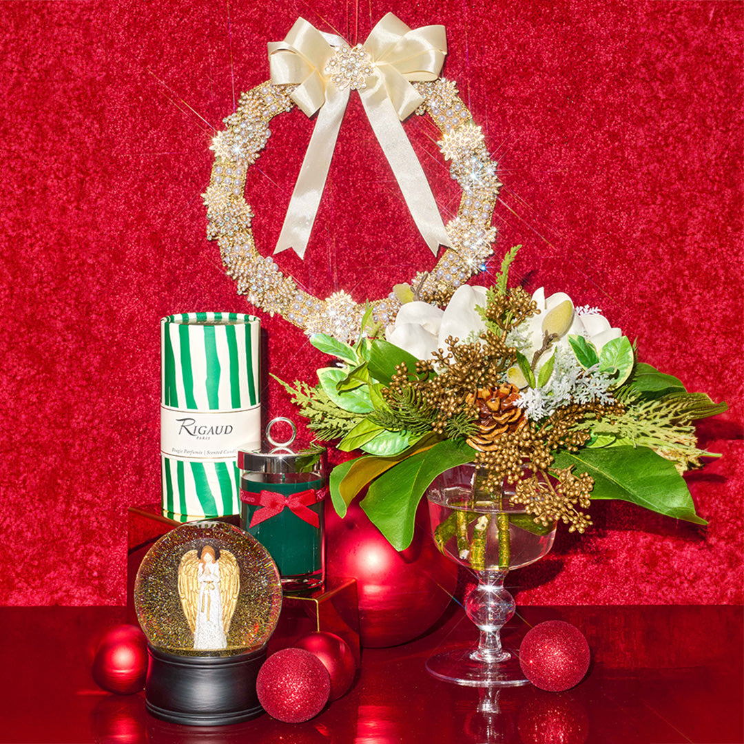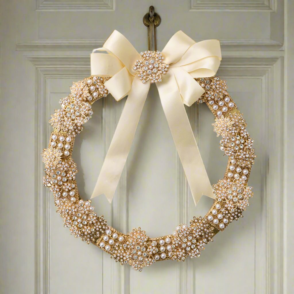Adorned with brooches that echo the allure of a bygone era, this distinctive wreath weaves together faux pearls and golden filigree into a tapestry of festive elegance.