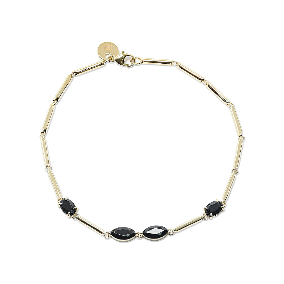 Sleek, elongated gold links meet faceted black jade in a design that’s quietly striking. Two marquise-cut center stones add a sculptural touch, framed by oval cuts for subtle contrast.