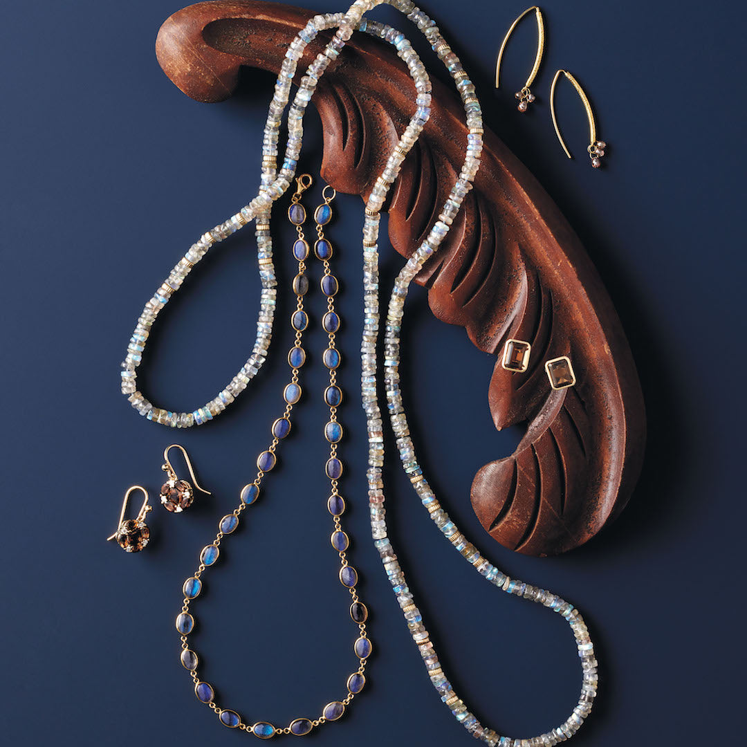 Our rope necklace highlights the intrinsic beauty of labradorite, elegantly capturing their rich tones with a timeless appeal. Punctuated by stations of gleaming gold beads, the design adds a rhythmic glint to this versatile long necklace — perfect for doubling or wearing long and loose.