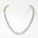 Simple statements of elegance, pearls have been a mainstay in Gump's fine jewelry assortment for decades. Revered for their alluring luster and classic beauty, they are widely recognized as symbols of purity, integrity and wisdom gained through experience. To create this necklace, each pearl is carefully selected for quality, color and shape. Blue Akoya cultured pearls, 7.5mm. Diamonds, 0.04ctw. Brushed 18-karat yellow gold. Hand-knotted on fine silk thread. 17"L.