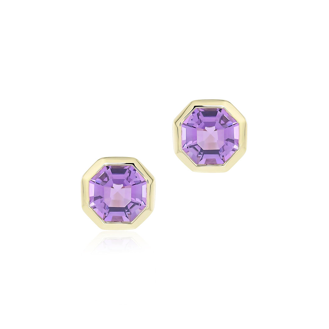 Asscher-cut amethyst stones are framed in octagonal gold settings, highlighting the gem’s precision and vivid purple hue. The structured silhouette offers a refined take on a stone long associated with promoting calm, clarity and spiritual awareness.