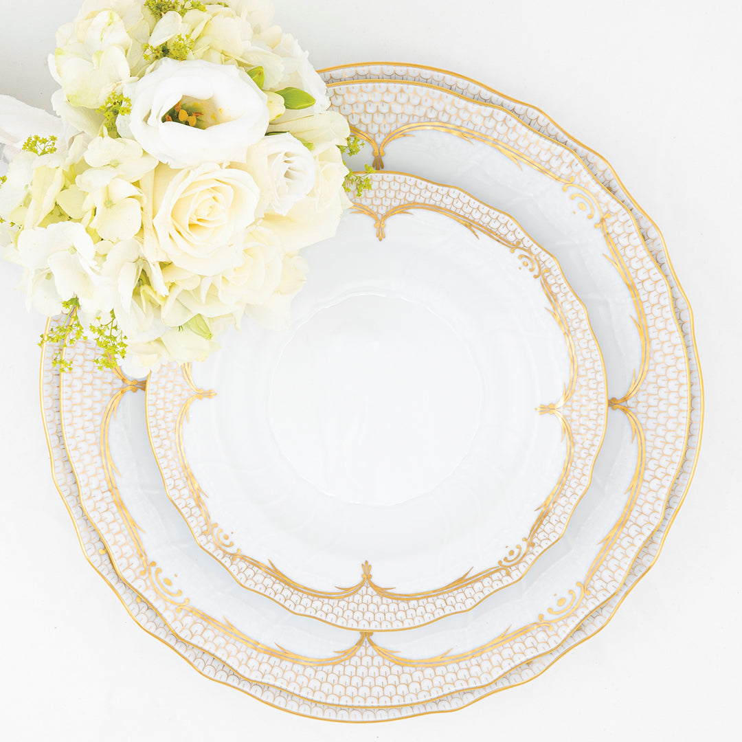 Made of white porcelain and handpainted by master artisans in Hungary, this elegant plate is bordered in 24-karat yellow gold. Herend’s porcelain creations feature a signature pattern that dates back to 1858, when a fish-scale decoration inspired a craftsman to create a similar design imitating feathers. 10 1/2" diam.