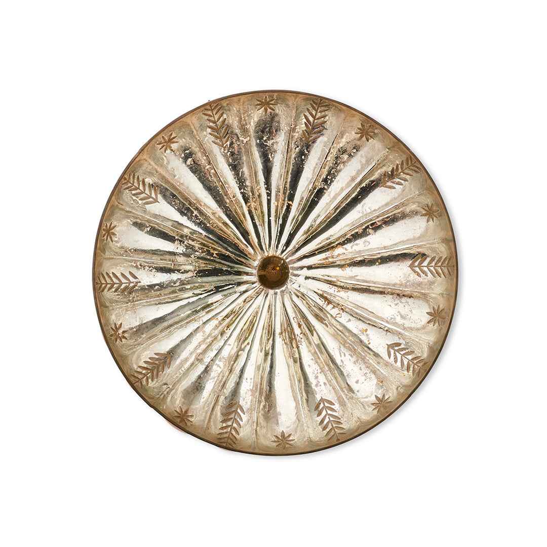 Our stunning bowl glows with old-world elegance. Resting on a graceful pedestal, the scalloped glass is etched with leafy sprays and stars. Its gilded silver interior lends a warm shimmer, making it perfect for holiday centerpieces or festive serving.