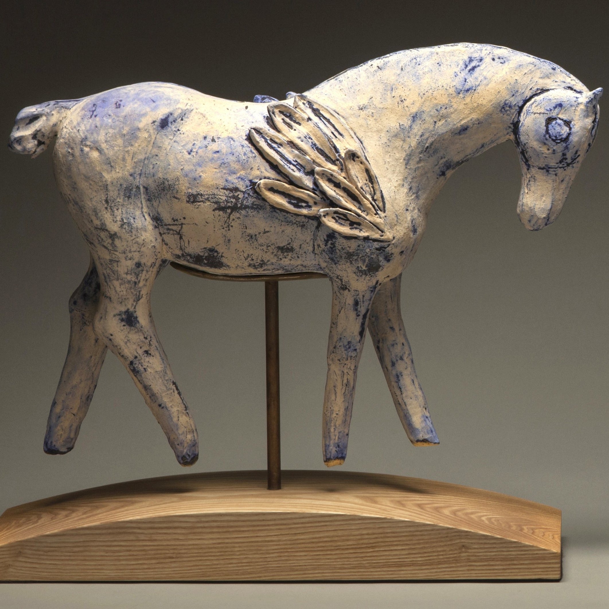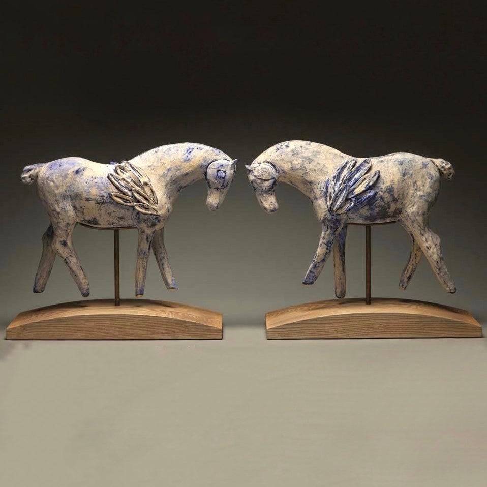 Amy Laugesen is a Colorado-based sculptor known for her modern-day equine “relics” that span from large-scale commissioned public artworks to small mixed-media treasures. Primarily working with ceramics, Laugesen has mastered techniques to create works that look ancient, drawing from Eastern and Western clay sculpting traditions, and a variety of glazing methods to achieve the unique color of each sculpture. Of the work, Laugesen shares, “ Sun and Moon is connected to mythology—the mythology of both horses, like Pegasus, but also Gods or Goddesses from ancient Greece, Rome and Celtic traditions. Winged horses are said to connect heaven and earth, to pull the sun across the sky with a chariot of horses, or to rise with the sun to watch over the earth—depending on the culture. Sun and Moon features a combination of underglazes and commercial glazes to achieve the aged look. I see the glazes that I use more like a patina on bronze, and I am really looking to combine them to evoke earlier civilizations.”