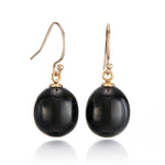 Black nephrite jade ovals are suspended from minimalist gold hooks, offering a grounded sense of form and tradition.