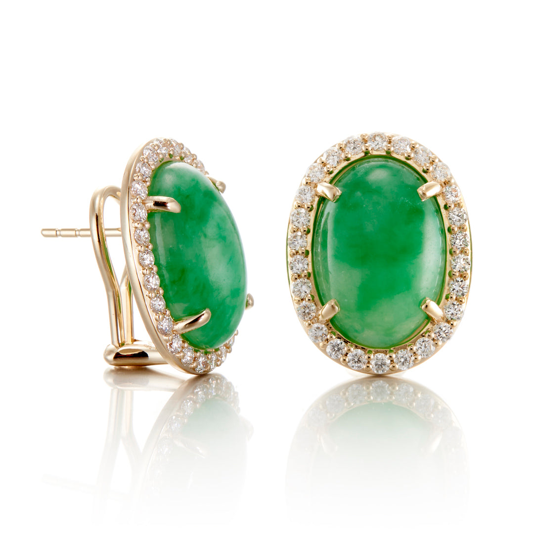 Elegant earrings featuring green jade cabochons surrounded by a border of sparkling diamonds.