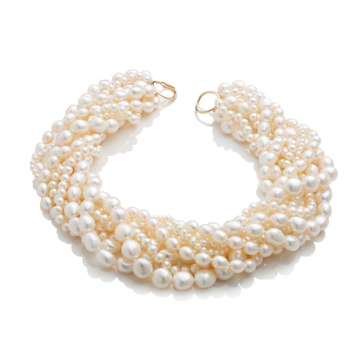 Timeless and classic, pearl necklaces have been a mainstay in Gump's fine jewelry assortment for decades. Comprised of eight strands of baroque pearls of all different shapes and sizes. White freshwater cultured pearls. 14-karat yellow gold. 18"L.