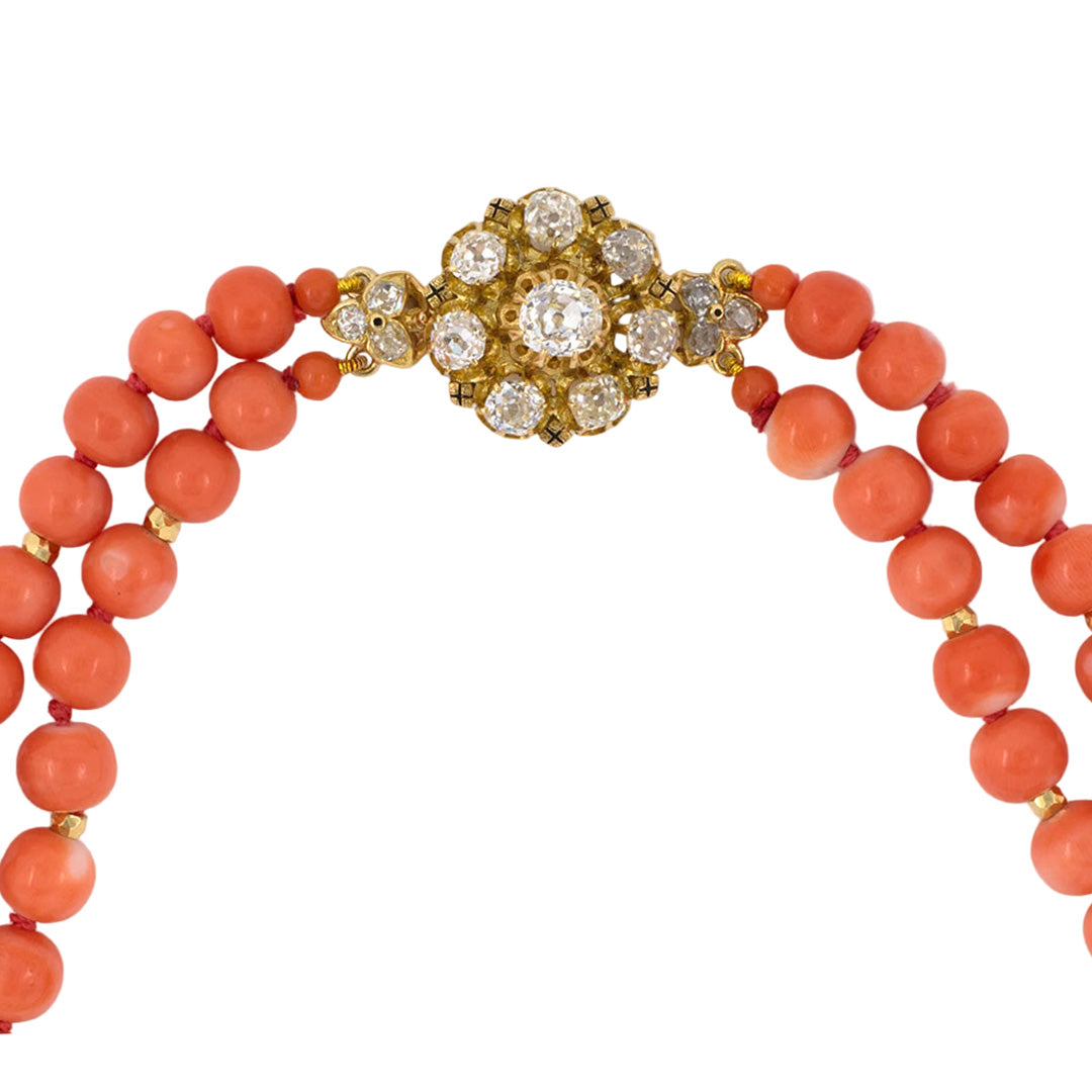 Richly hued coral beads, graduated in scale and accented with gold rondelles, form the twin strands of this Victorian necklace. A gold and black enamel floral clasp set with old-cut diamonds provides a luminous counterpoint, blending organic warmth with the era’s taste for opulent, hand-finished detail.