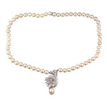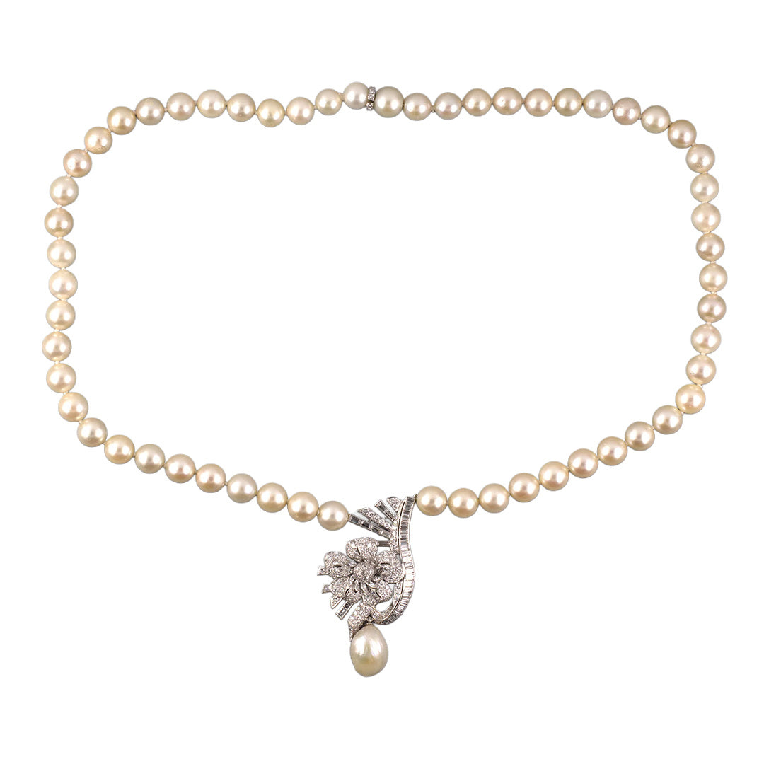 This midcentury showpiece combines lustrous Akoya pearls with a platinum floral swirl pendant set with brilliant- and baguette-cut diamonds. A single baroque South Sea pearl drop adds soft contrast to the structured design.
