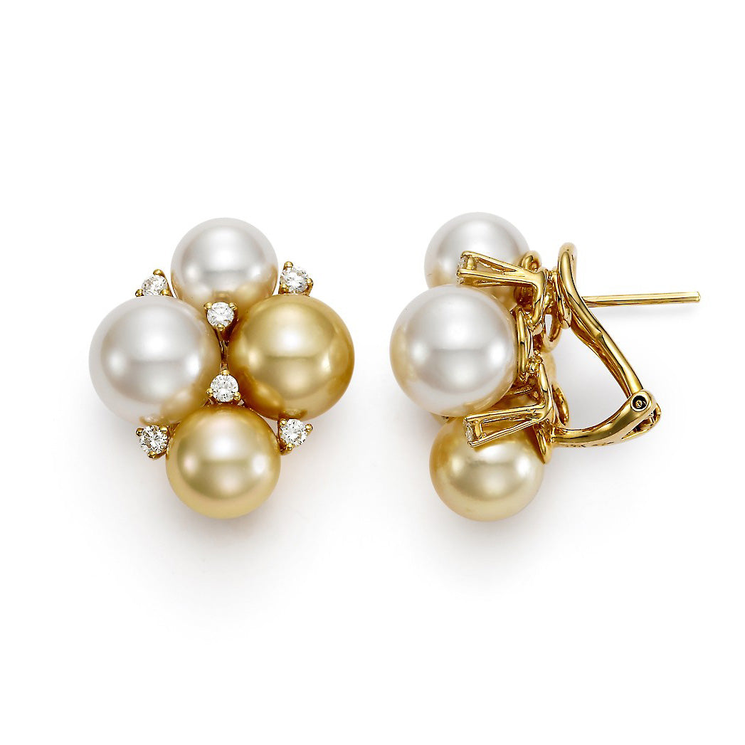 Four lustrous South Sea pearls — two in radiant white, two in warm golden — gather in a richly dimensional cluster. Sprinkled among them are brilliant white diamonds for a touch of unexpected sparkle.
