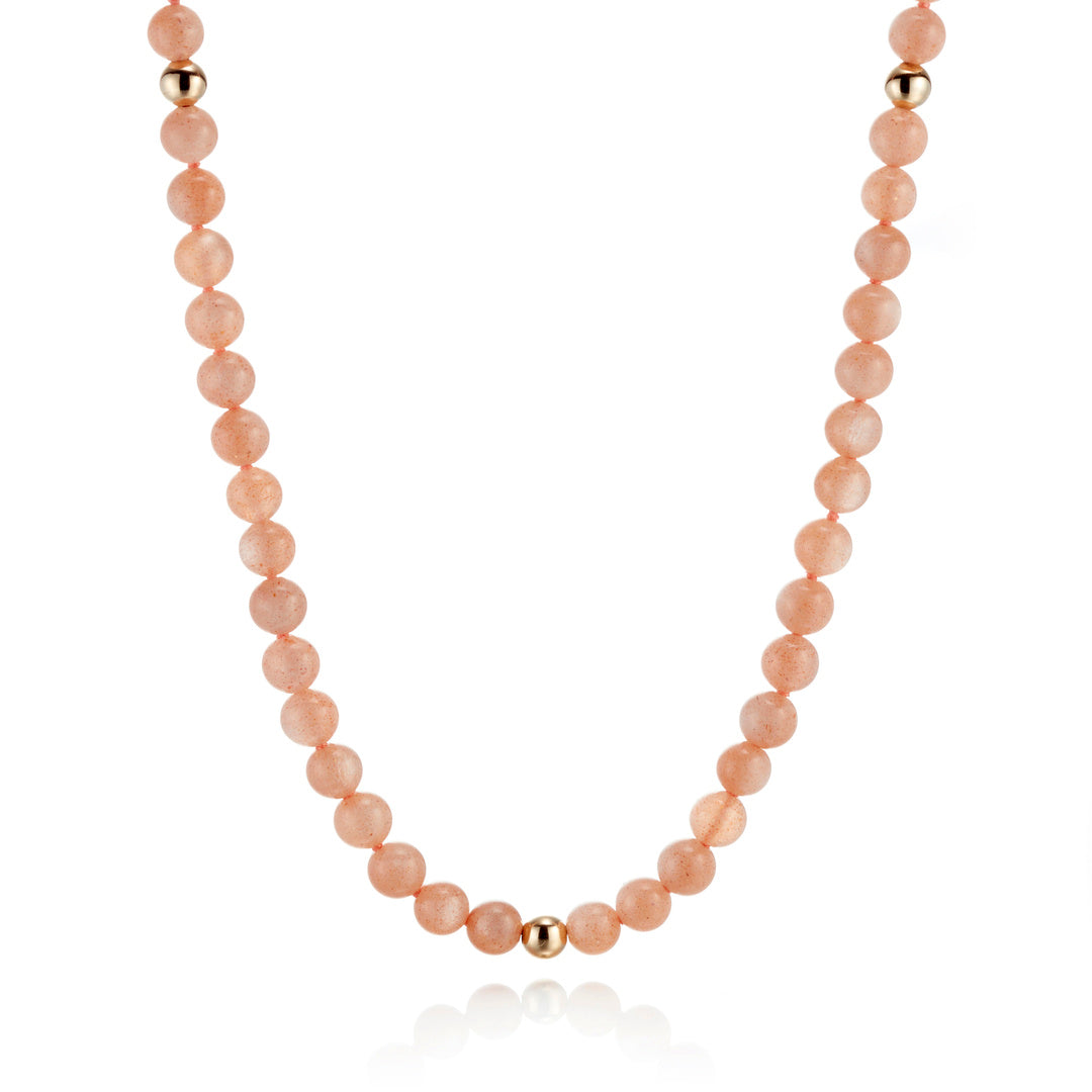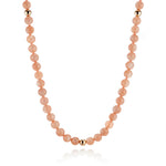 Lustrous peach moonstone beads are interspersed with subtle gold accents in a necklace that gracefully drapes, offering a warm, gentle glow that complements the wearer's natural style.