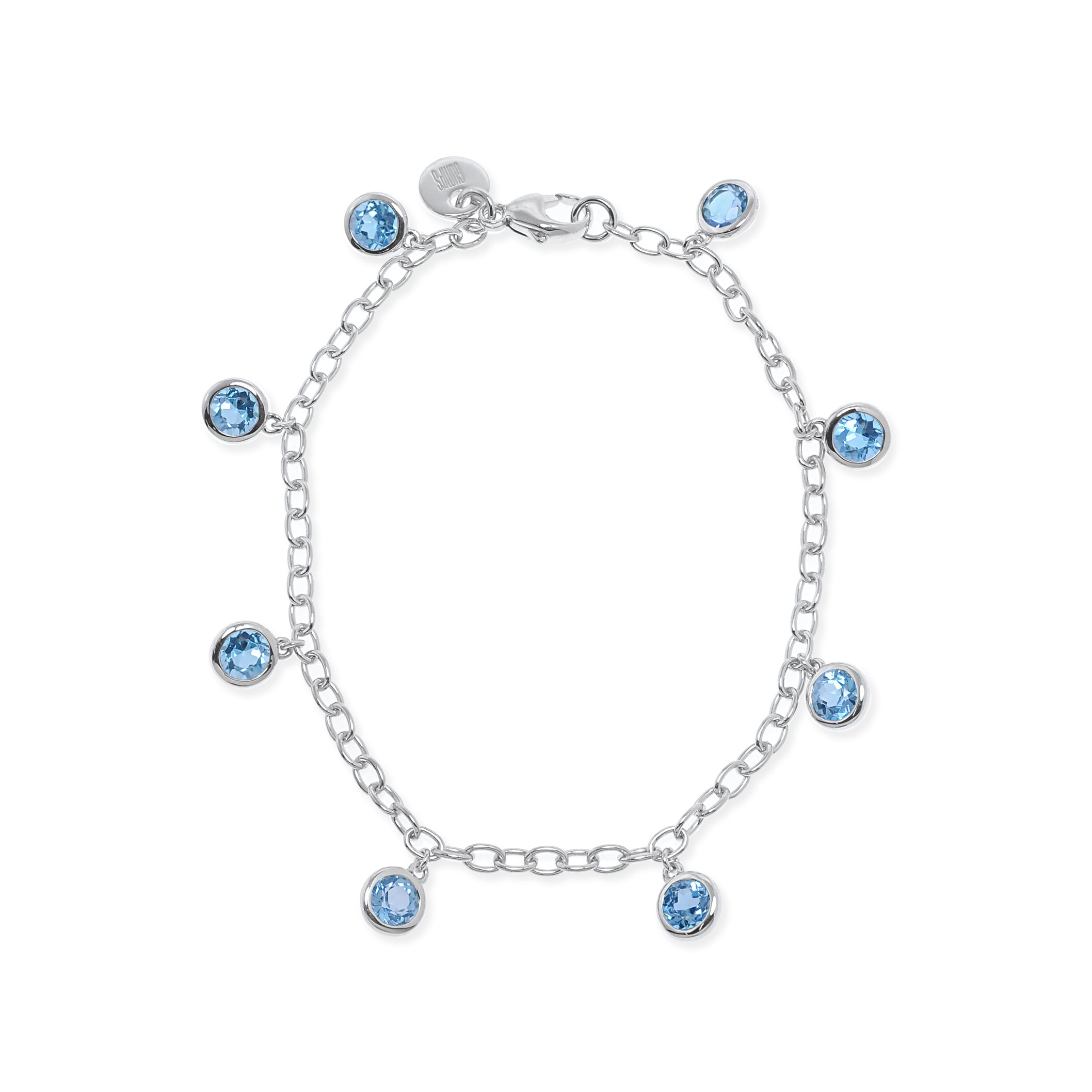 Faceted Swiss Blue topaz rounds appear like falling dewdrops on our sterling silver link bracelet.