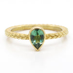 A pear-shaped green tourmaline stacking ring on an 18-karat gold braided band.