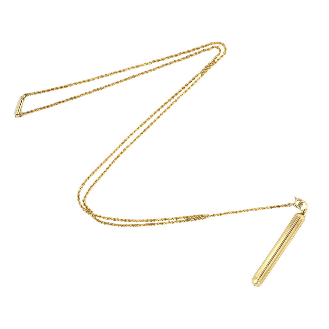 A refined relic of the Art Deco era, this gold retractable pencil pendant pairs elegance with ingenuity. Its streamlined, fluted case conceals a telescoping pencil, offering both practicality and timeless sophistication on its own or hanging from your favorite chain.