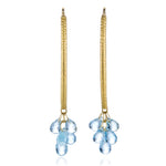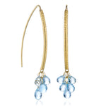 Elongated gold navettes with a lightly textured finish suspend clusters of aquamarine briolettes, each drop softly faceted to reveal watery, translucent blue. The composition feels fluid and airy, with gentle movement at every turn.