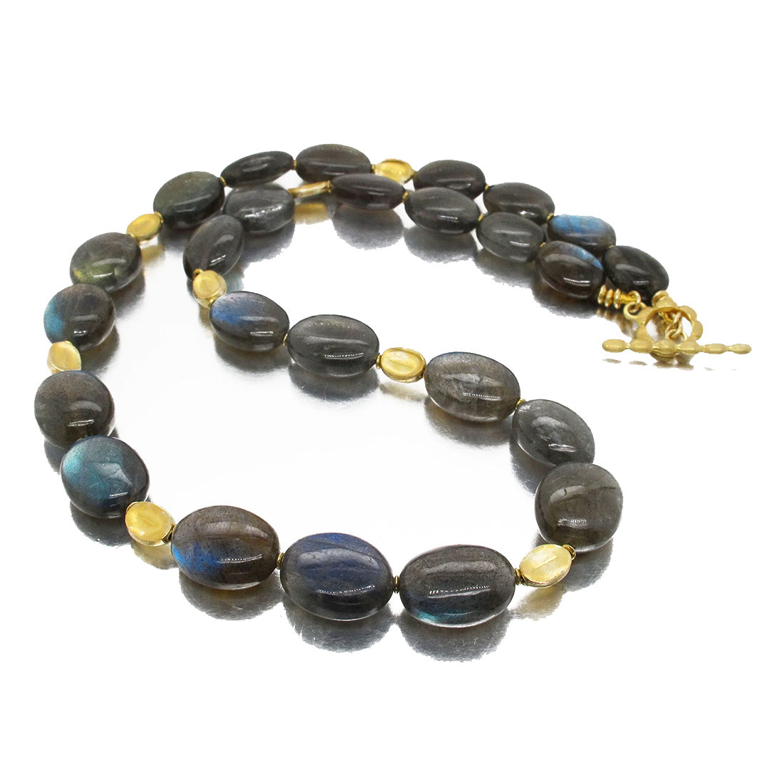 A wrap bracelet featuring aquamarine beads, gold bead spacers and a lobster clasp with a 2" long extension chain. Can also be worn as a necklace.