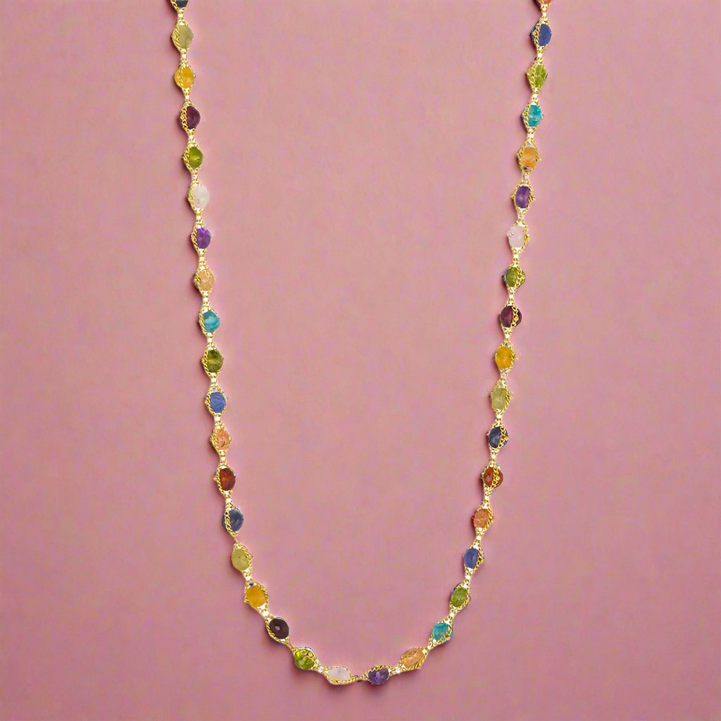 Made with fire opals — named for their warm-toned hues — this necklace speaks of passion as a gradient of color cascades from bright orange to white. Each stone is hand woven with yellow gold chain to complete this stunning work of art.