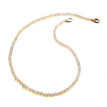 A strand of graduated opal beads forms a soft spectrum of light, each stone revealing flashes of color within its translucent body.