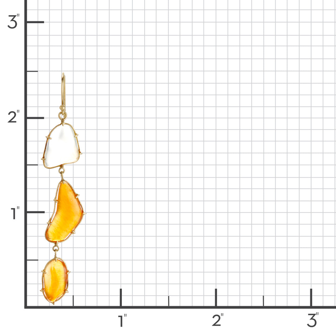 Organic slices of Mexican fire opal descend in a three-stone composition, each held in minimalist gold prongs that emphasize their natural contours. Shifting from pale translucence to fiery orange, the earrings celebrate the stone’s raw beauty and dramatic color range.