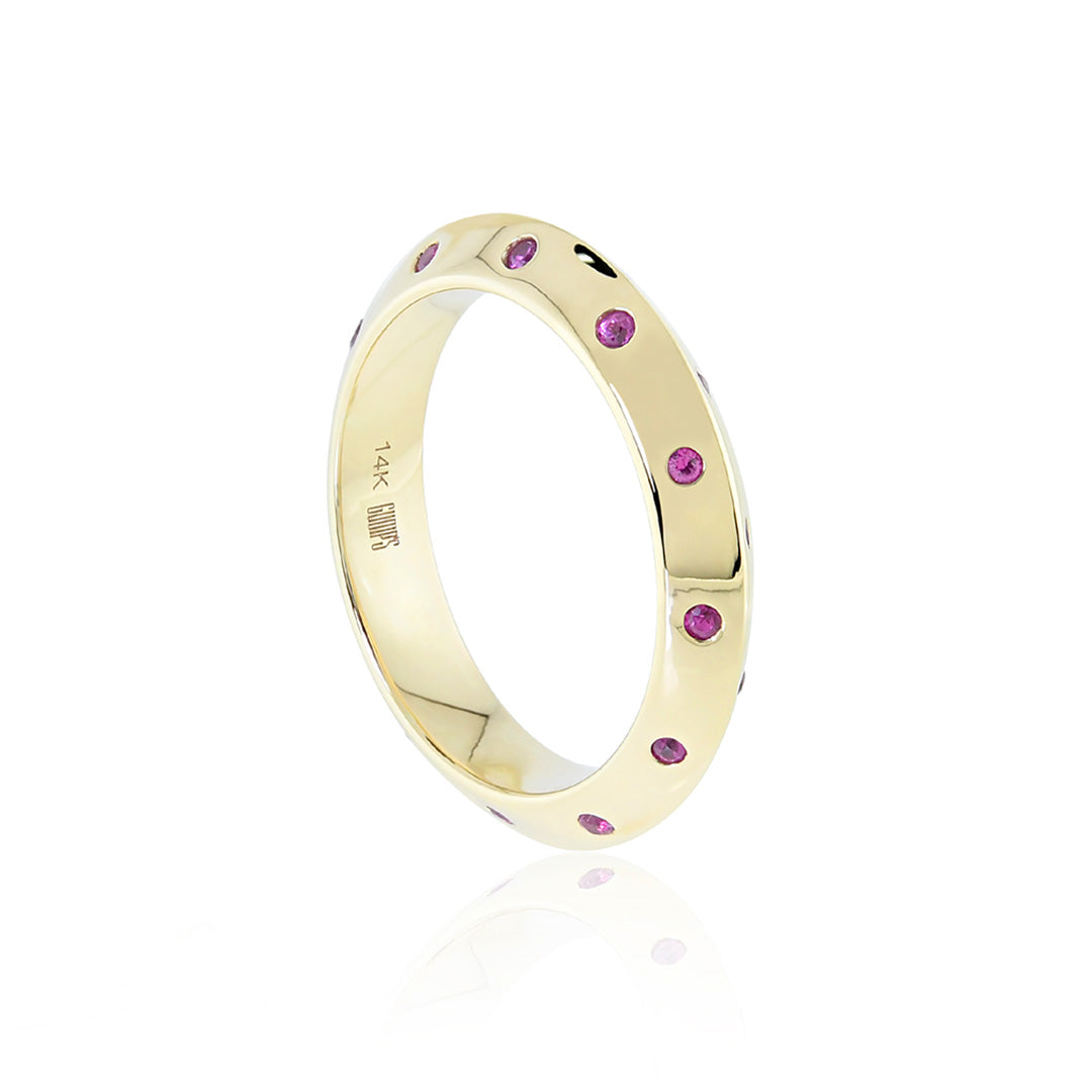 Scattered pink sapphires lend a playful rhythm to this polished gold band. The sleek silhouette balances whimsy with restraint for a quietly unexpected take on a classic form.