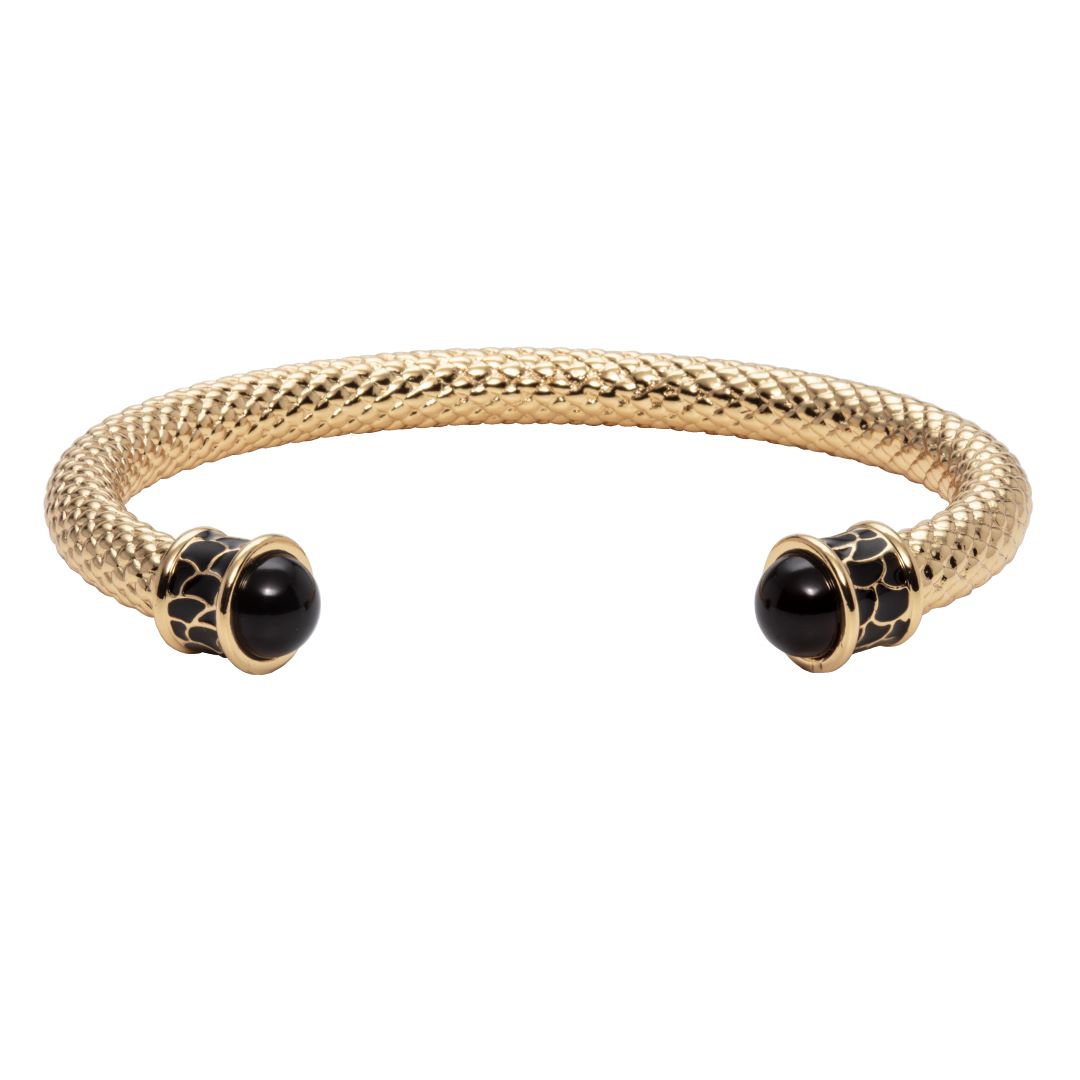 One of the oldest and most enduring styles of jewelry throughout history, torques have symbolized everything from wealth and nobility to bravery in a warrior. Halcyon Days has crafted theirs of 18-karat gold-plated brass with chic glass cabochons at each end, accented with a hand-applied amphibian-inspired design.