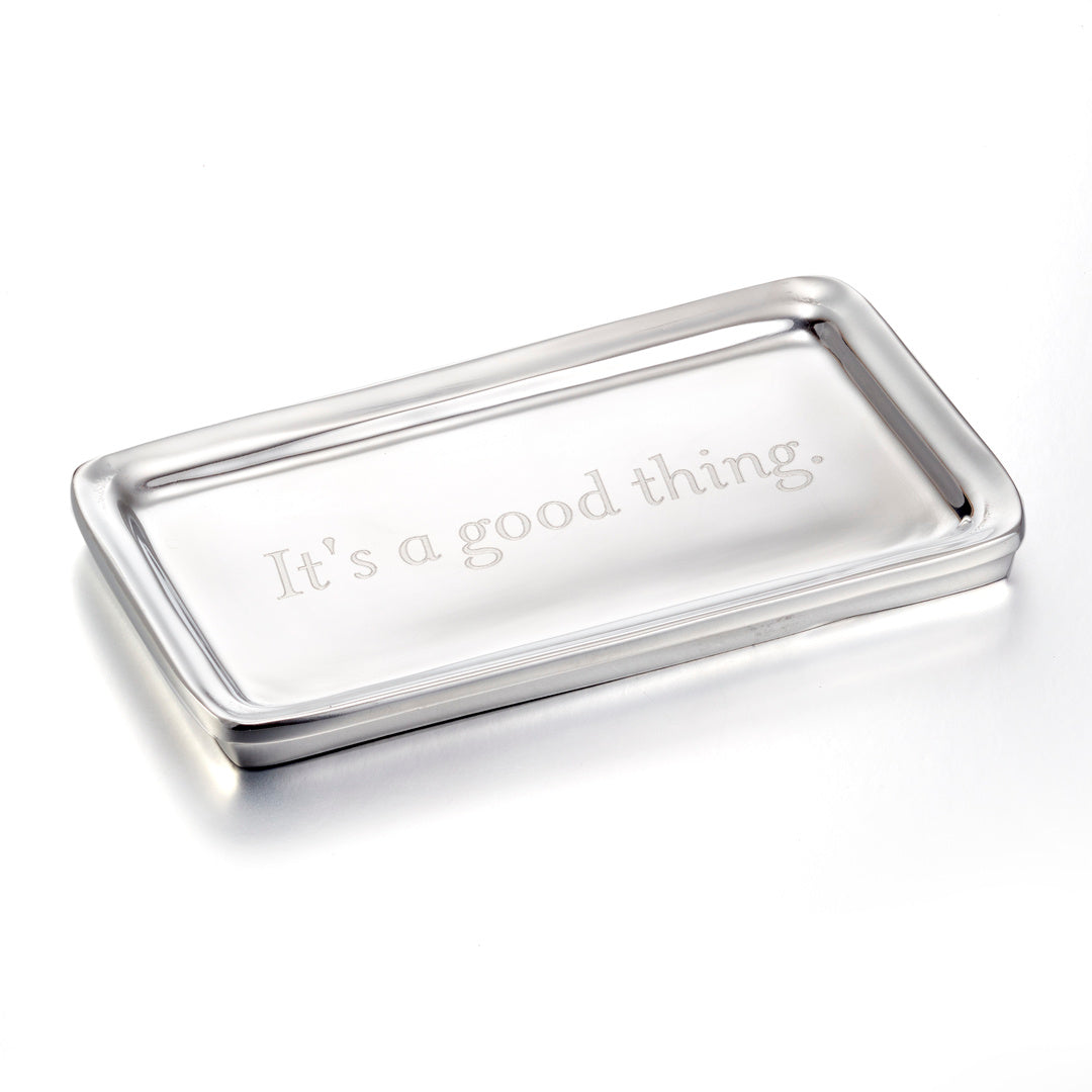 A simple phrase, beautifully cast — this trinket tray brings a little silver lining to your dresser, desk or bar. Crafted from sand-cast aluminum with a soft gleam, it's a thoughtful gesture wrapped in timeless understatement.