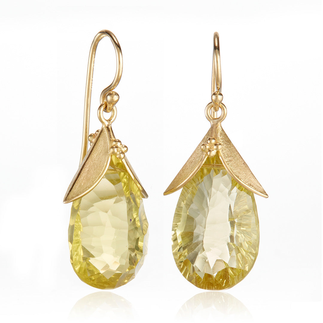 Vivid yellow lemon quartz briolettes accented with gold double-leaf caps make these drop earrings refreshingly modern.