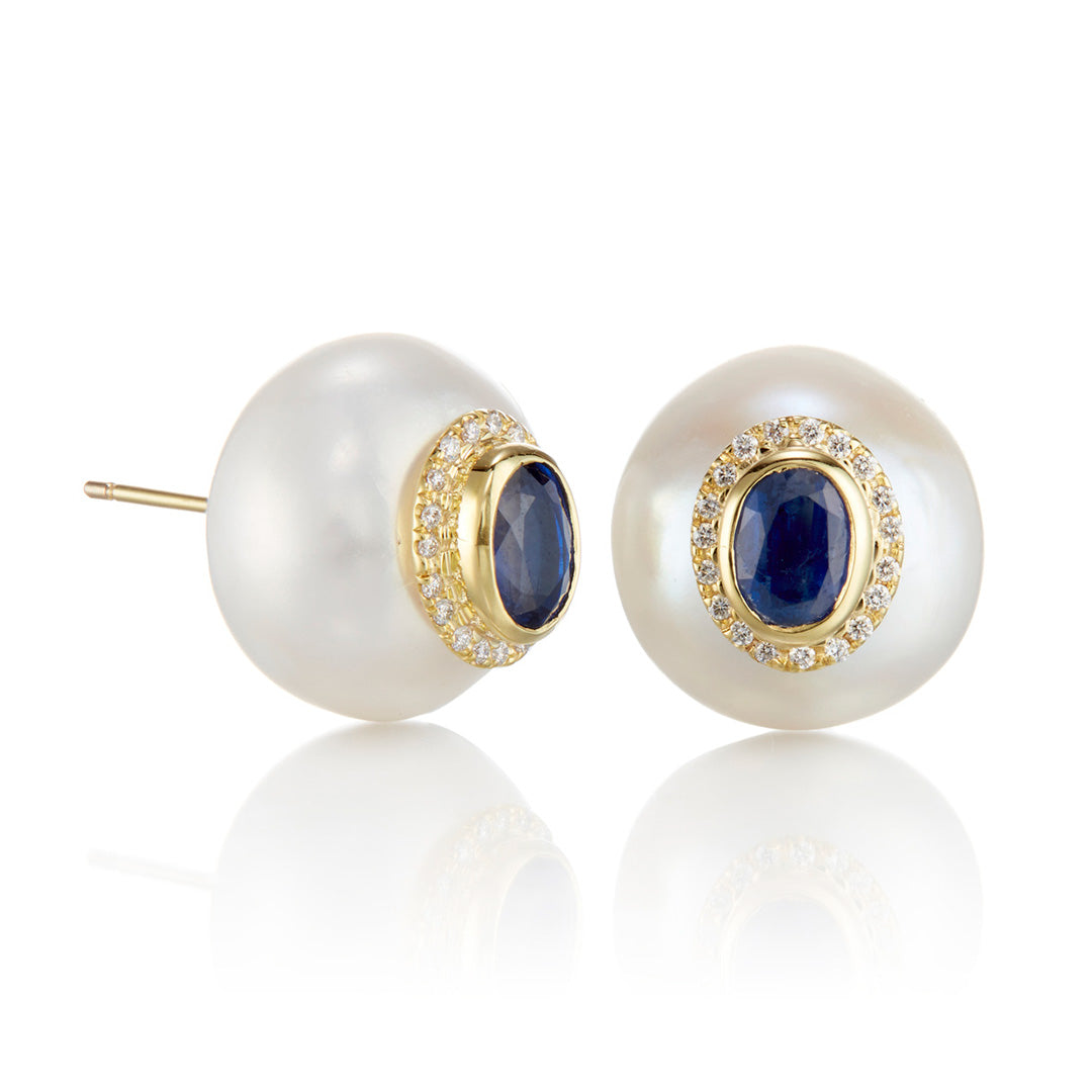 A study in contrast, this sculptural pairing brings together the bold elegance of baroque pearls and the deep, denim-like richness of kyanites. A halo of diamonds adds just the right sparkle.
